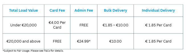 A card cost of €4.99 each and a handling fee of 1.95% of the total load value apply when paying by debit/credit card. Please see our pricing matrix below for Bank Transfer OrdersQ: Why do employers pay a fee?